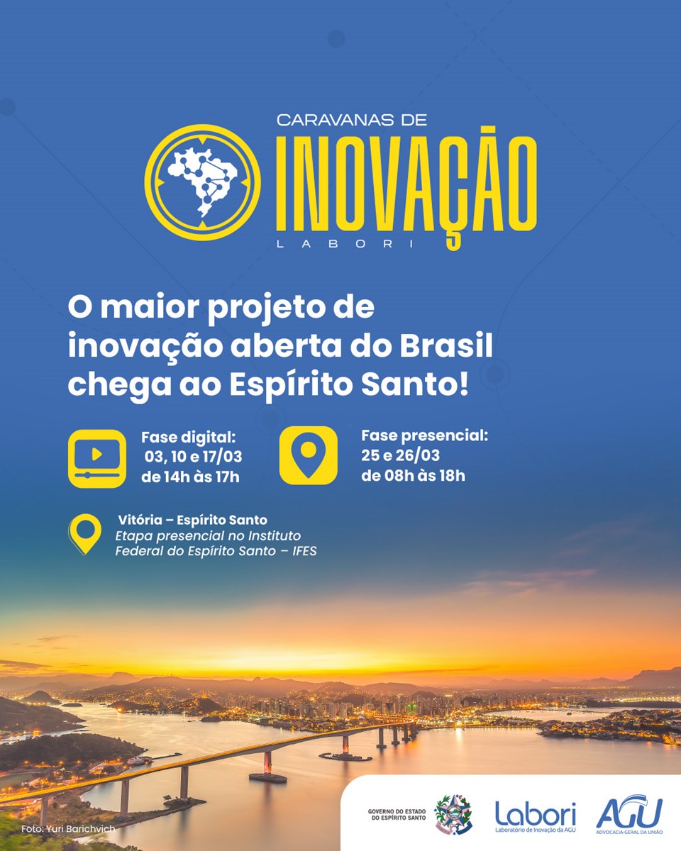 Coordenado pelo Laboratório de Inovação da AGU (Labori), a ação conta com a parceria da Procuradoria-Geral do Estado do Espírito Santo (PGE-ES) e das Secretarias da Ciência e Tecnologia (Sect) e de Gestão e Recursos Humanos (Seger). A iniciativa ocorrerá em duas etapas: a primeira, em formato virtual, nos dias 3, 10 e 17 de março; e a segunda, em dois encontros presenciais, nos dias 25 e 26 de março, no Instituto Federal de Educação, Ciência e Tecnologia do Espírito Santo (Ifes), em Jucutuquara, Vitória.