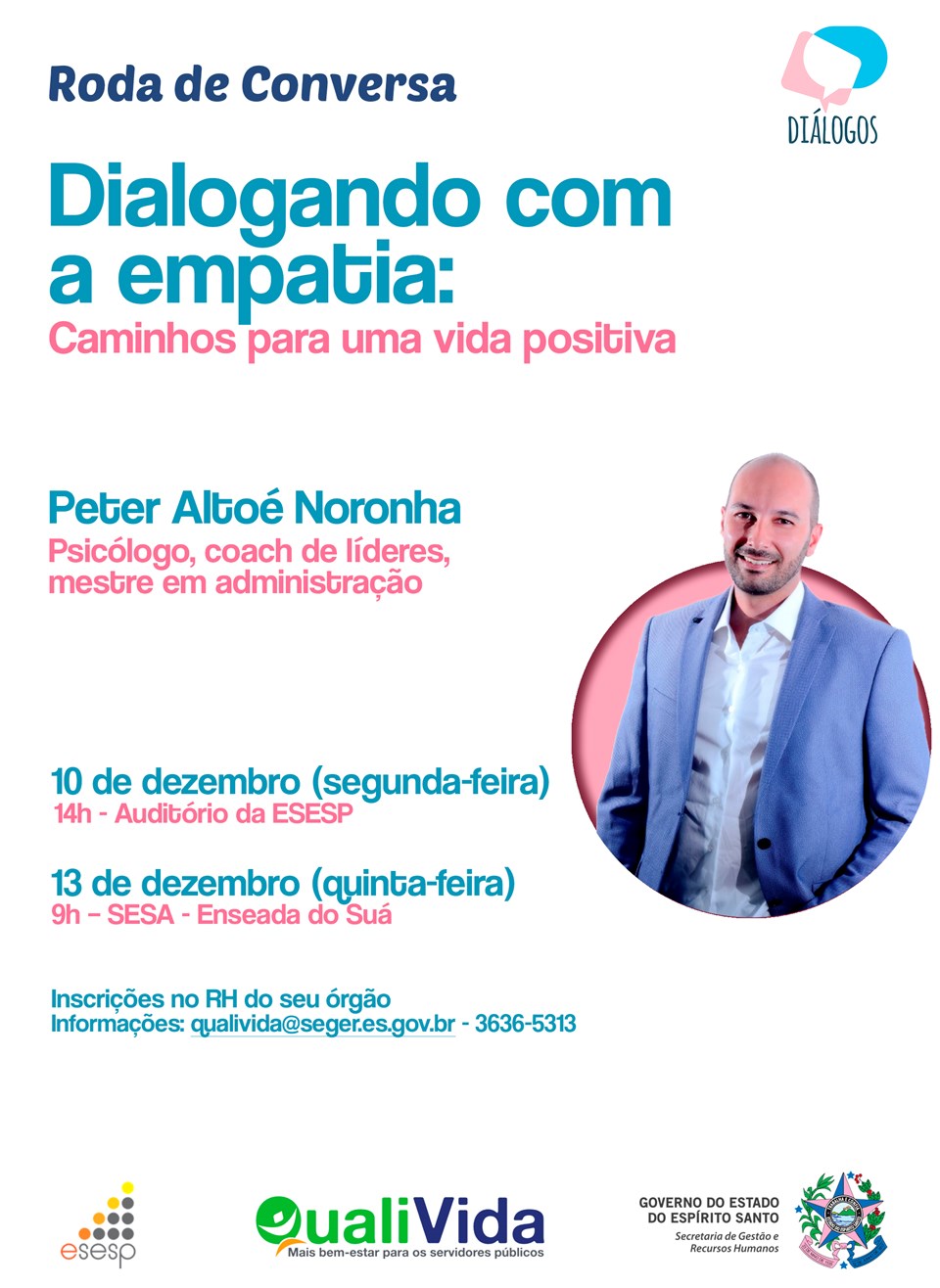 Com objetivo de fomentar caminhos para uma vida positiva, a Secretaria de Estado de Gestão e Recursos Humanos (Seger), por meio do Programa Qualivida, realizará rodas de conversa com o tema “Dialogando com empatia”, na próxima segunda-feira (10), às 14 horas, no auditório da Escola de Serviço Público do Espírito Santo (Esesp), e na quinta (13), às 9 horas, na Secretaria de Estado da Saúde (Sesa).