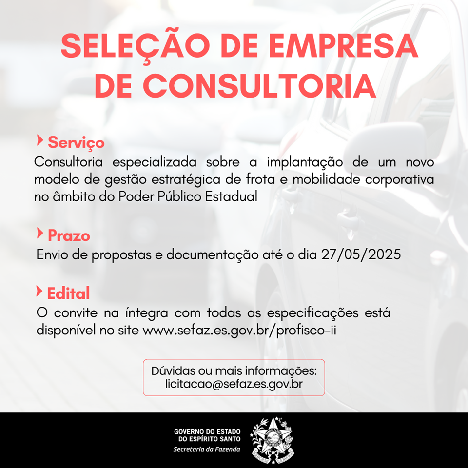 A Secretaria da Fazenda (Sefaz) publicou um edital de convite para a seleção de consultoria sobre a implantação de um novo modelo de gestão estratégica de frota e mobilidade corporativa no âmbito do Poder Público Estadual. O documento na íntegra com todas as especificações está disponível no site www.sefaz.es.gov.br/profisco-ii.