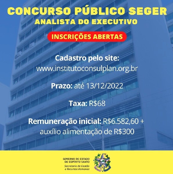 Estão abertas as inscrições para o concurso público da Secretaria de Gestão e Recursos Humanos (Seger) referente ao cargo de Analista do Executivo. O cadastro pode ser efetuado pelo site da banca organizadora - www.institutoconsulplan.org.br, até as 16 horas do próximo dia 13 de dezembro. A taxa para se inscrever é de R$ 68,00.