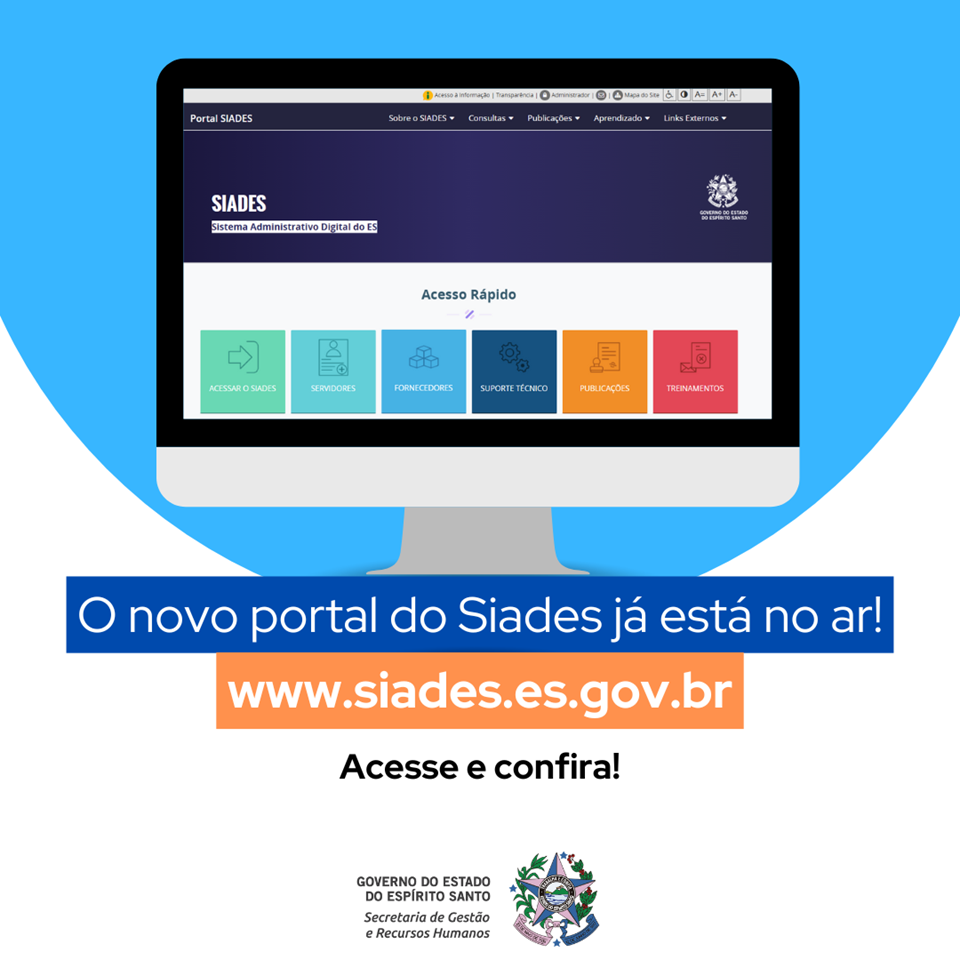 O Sistema Administrativo Digital do Espírito Santo (Siades) ganhou um novo portal, que já está disponível aos usuários. Para conferir basta acessar www.siades.es.gov.br.