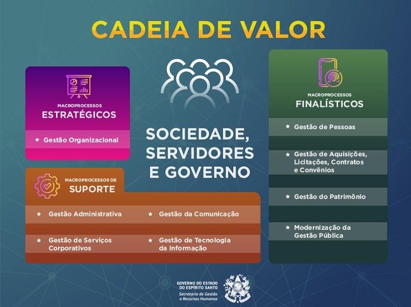 Com o objetivo de ter uma administração cada vez mais inovadora, ágil e eficiente, a Secretaria de Gestão e Recursos Humanos (Seger) acaba de atualizar a sua Cadeia de Valor. O novo modelo passou a ter 276 processos organizacionais, distribuídos em nove macroprocessos, classificados como Estratégicos, Suporte e Finalísticos. O resultado pode ser conferido no site https://seger.es.gov.br/cadeia-de-valor-2 .