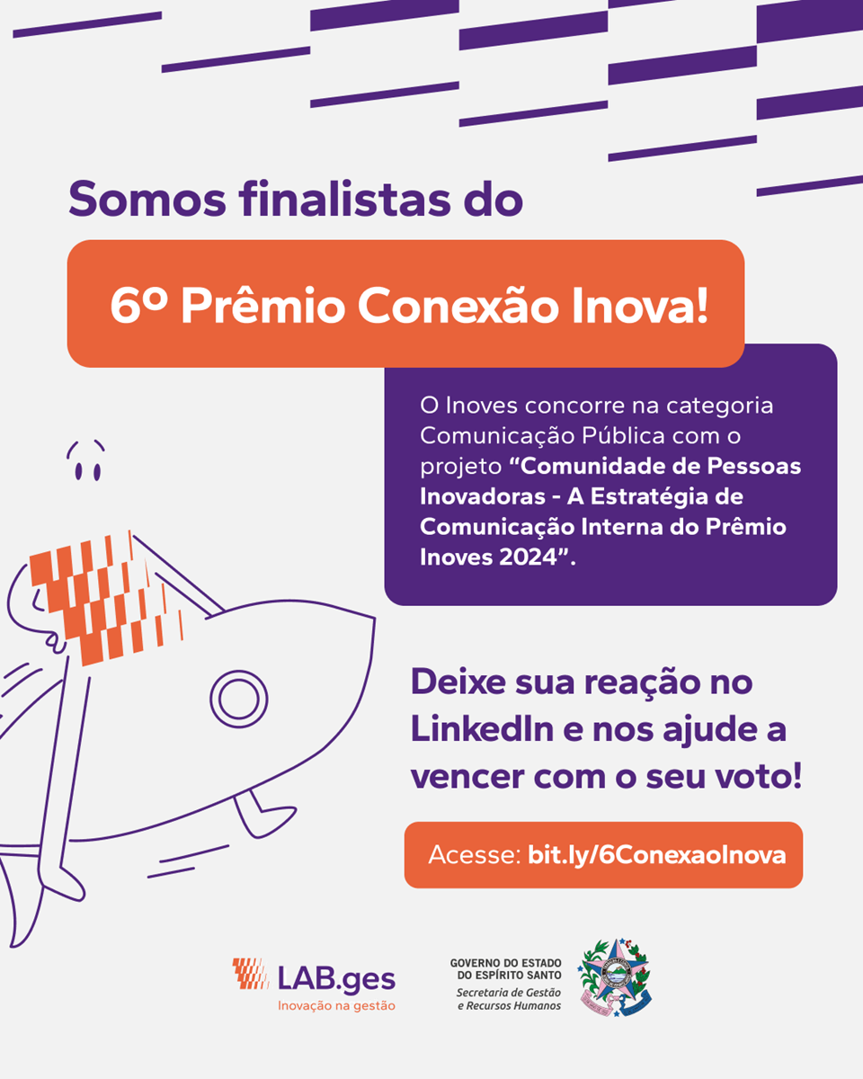 O LAB.ges disputa a premiação na categoria Comunicação Pública com o projeto “Comunidade de Pessoas Inovadoras - A Estratégia de Comunicação Interna do Prêmio Inoves 2024”. Nessa categoria, os projetos concorrem em duas frentes de avaliação: por voto popular, que define um dos reconhecimentos, e pela avaliação técnica do júri do prêmio, ampliando as possibilidades de conquista.