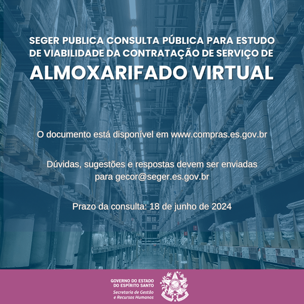 “A contratação de almoxarifado virtual visa garantir a padronização de preços e qualidade dos itens adquiridos pelo Governo, reduzir a quantidade de materiais parados em estoque e promover economia processual com a aquisição de materiais de consumo administrativo. Por meio da consulta pública será possível verificar a existência de interessados na prestação desse serviço e também aperfeiçoar as especificações técnicas do termo de referência, que norteará a melhor forma de contratação”, explicou o secretário de Estado de Gestão e Recursos Humanos, Marcelo Calmon.