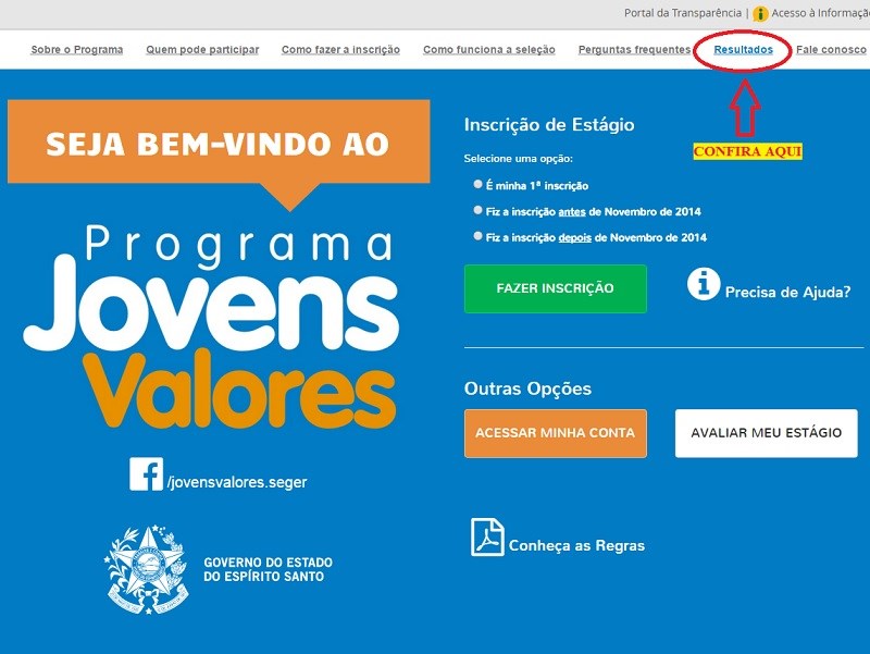 Se você é estudante dos ensinos médio, técnico ou superior e se inscreveu no programa de estágio Jovens Valores, já pode conferir se seu nome está na lista da primeira chamada dos pré-selecionados para as vagas. Ela está disponível no site www.jovensvalores.es.gov.br, no menu Resultados.