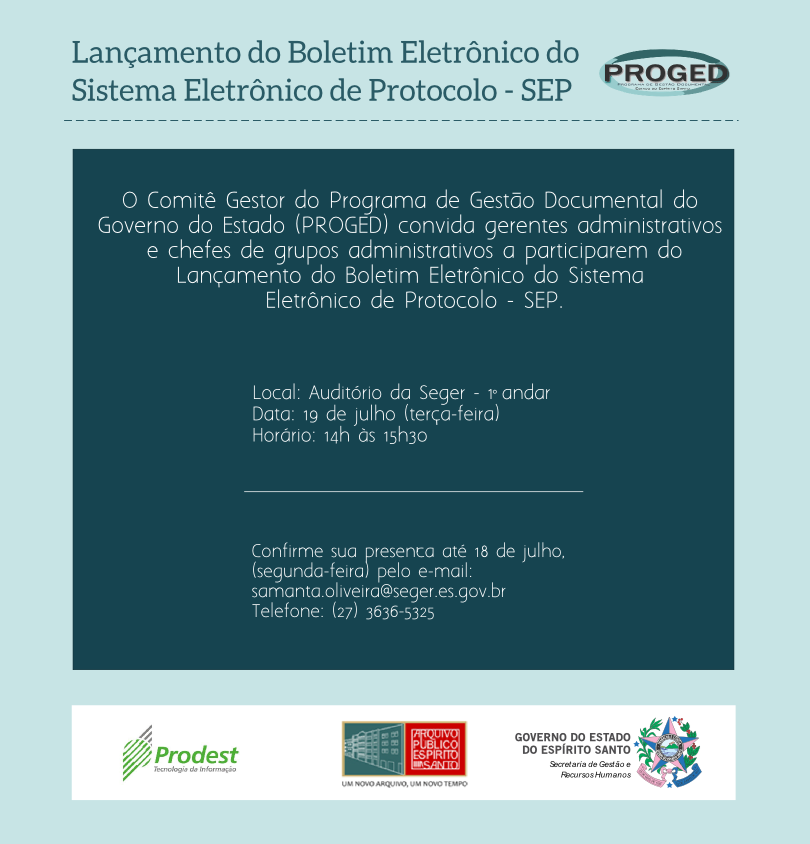 Na próxima terça-feira (19), será promovido pelo Comitê Gestor do Programa de Gestão Documental do Governo do Estado (Proged) o Lançamento do Boletim Eletrônico do Sistema Eletrônico de Protocolo (SEP).